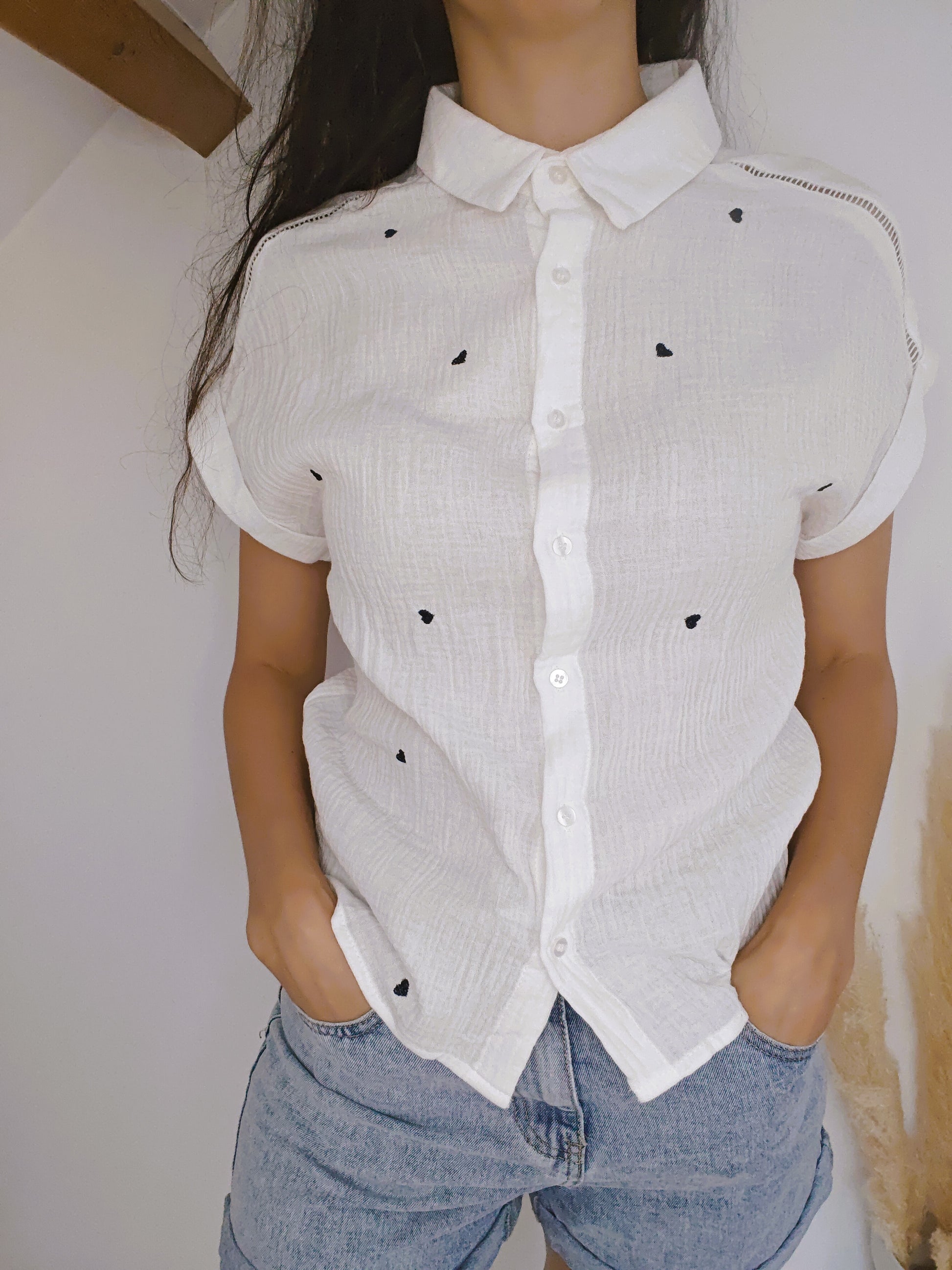 Douce et romantique, cette blouse en gaze de coton blanche est parsemée de jolis cœurs bleus pour une touche délicatement poétique. Son tissu léger et respirant offre un confort inégalé, parfait pour les journées ensoleillées. Avec sa coupe fluide et son imprimé tendre, elle se porte aussi bien avec un jean qu'avec une jupe pour un look frais et plein de charme.