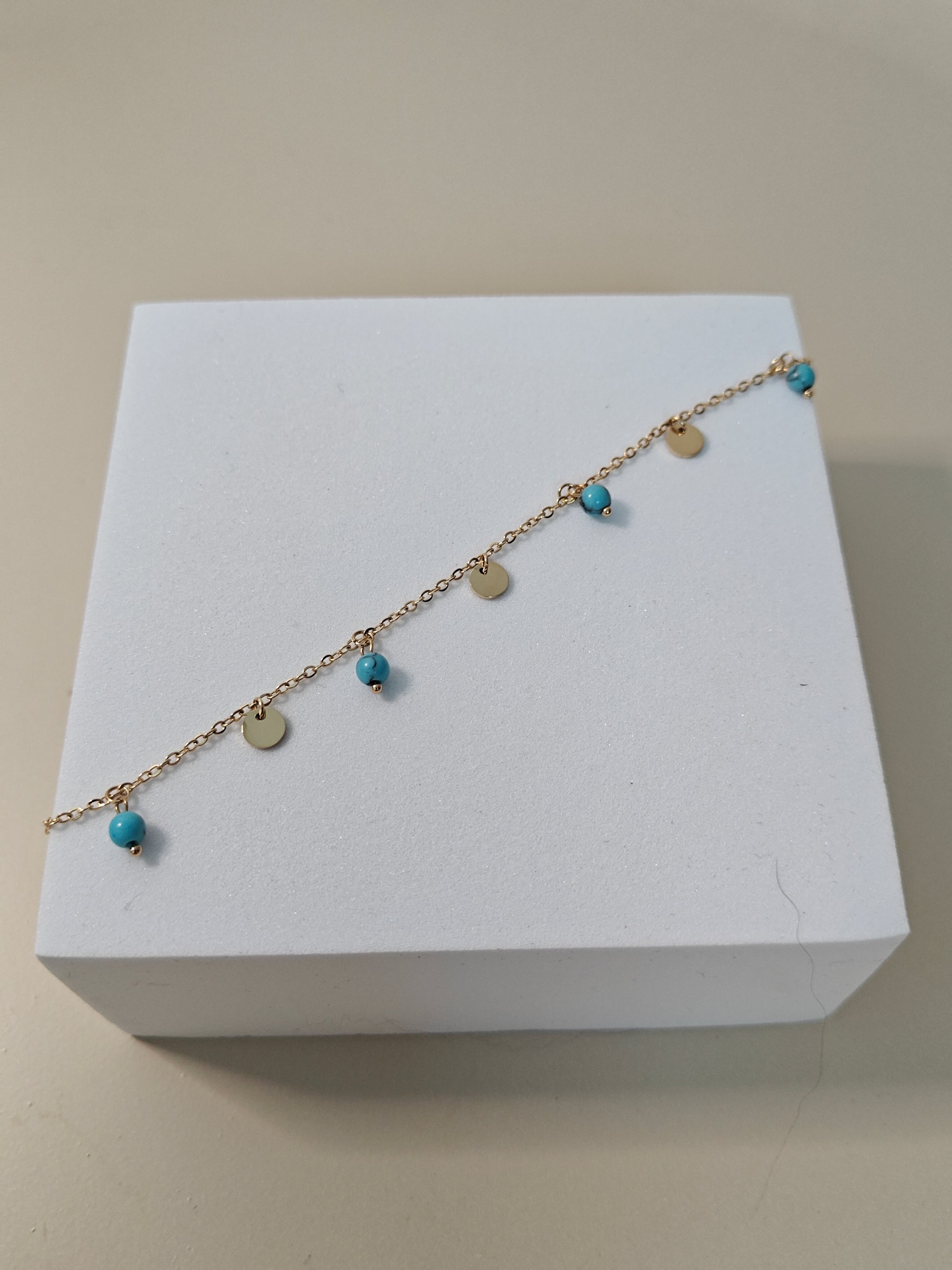 Un bracelet de cheville raffiné mêlant perles bleues profondes et touches dorées, pour une allure chic et lumineuse en toute simplicité.