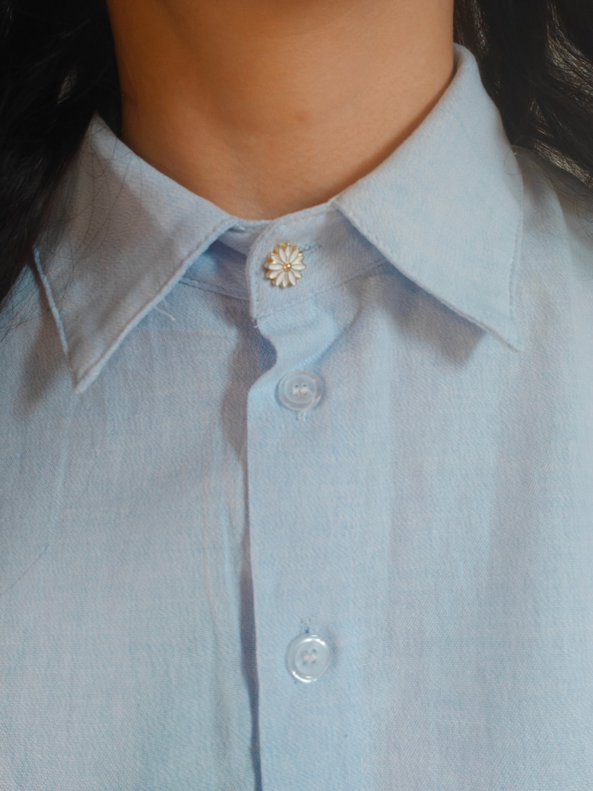 Cette chemise bleue allie sobriété et caractère avec une coupe épurée et un tissu fluide au tombé naturel. Sa teinte douce apporte une touche de fraîcheur discrète, tandis que le détail du dernier bouton attire l'œil : une marguerite comme un clin d'œil inattendu, raffiné et subtil.
