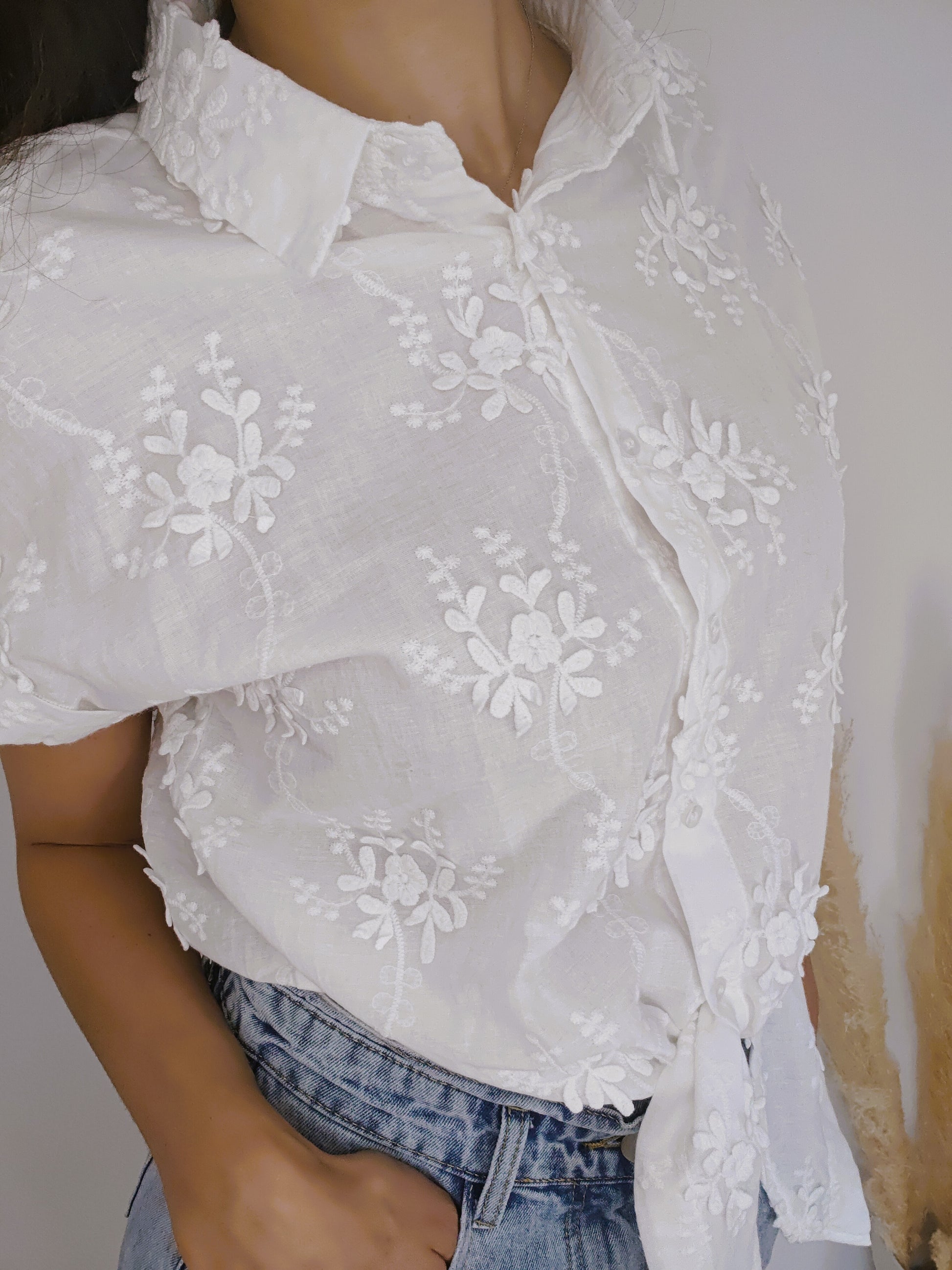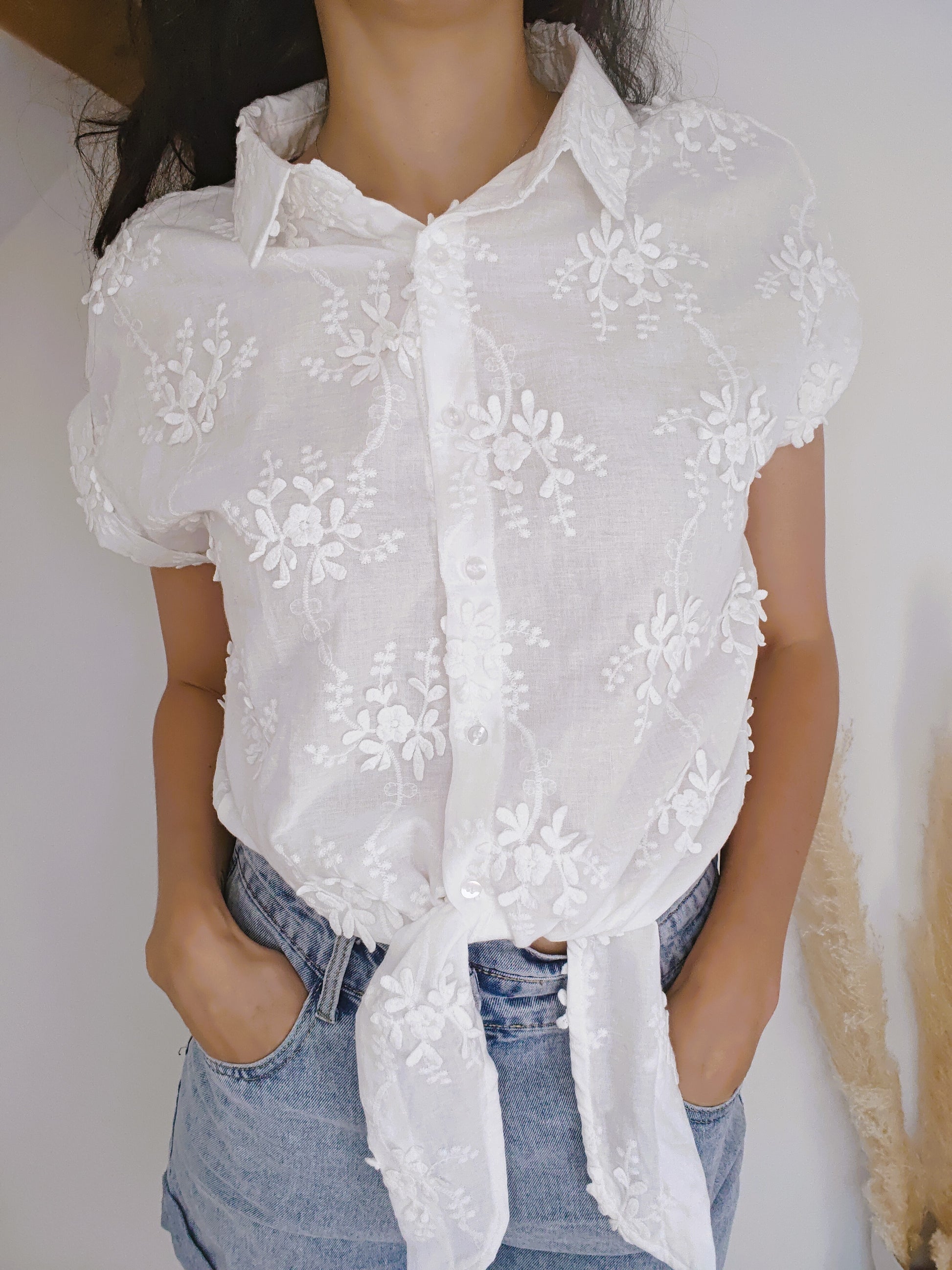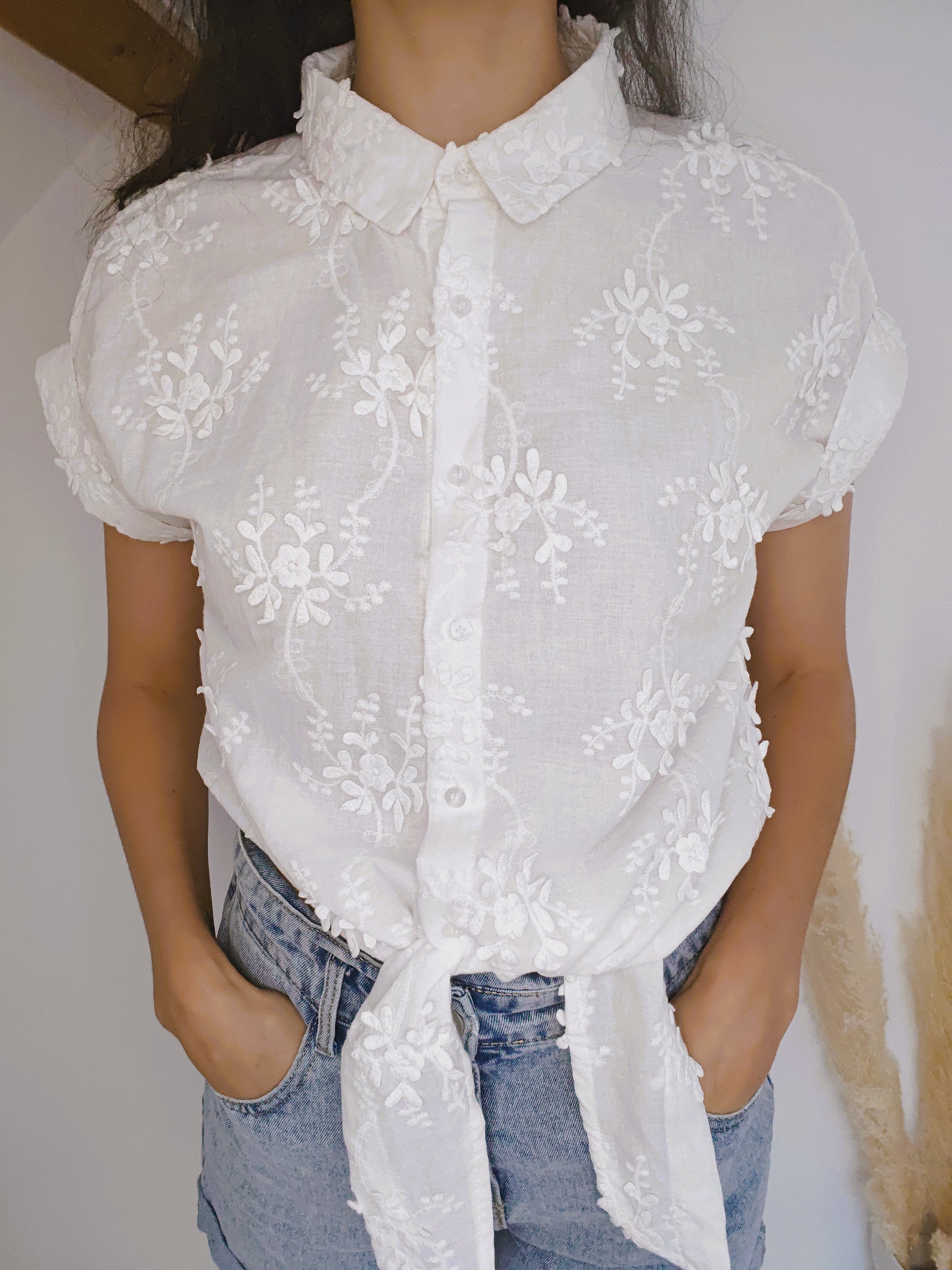 Élégant et intemporel, ce chemisier blanc rehaussé de dentelle dévoile une allure féminine et raffinée. Son tissu léger s'accompagne de délicats détails ajourés, parfaits pour sublimer une tenue avec douceur et romantisme. À porter aussi bien en journée qu'en soirée.