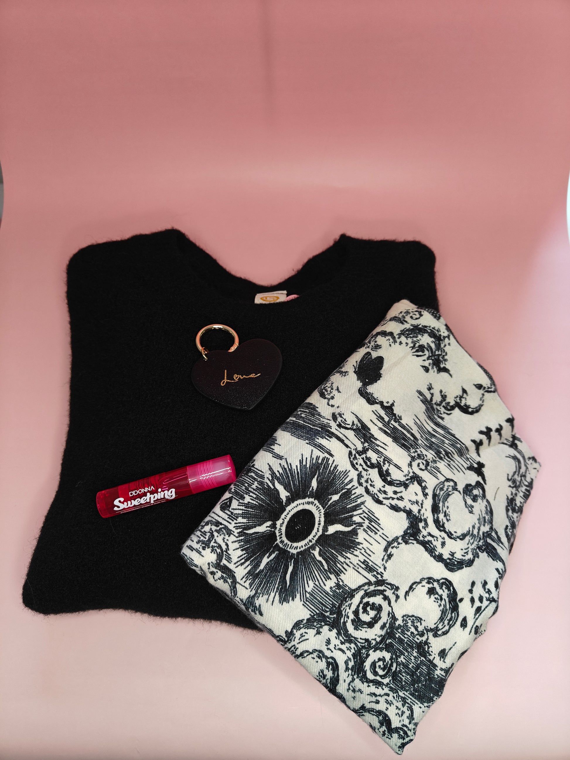 Sous les flocons, un écrin de tendresse : un pull qui réchauffe le cœur (pull Anaïs), une écharpe qui enlace les rêves, et un porte-clés porte-bonheur pour accompagner chaque jour. En cadeau, une huile pour les lèvres, comme un doux baiser d’hiver, pour illuminer les sourires sous la neige.