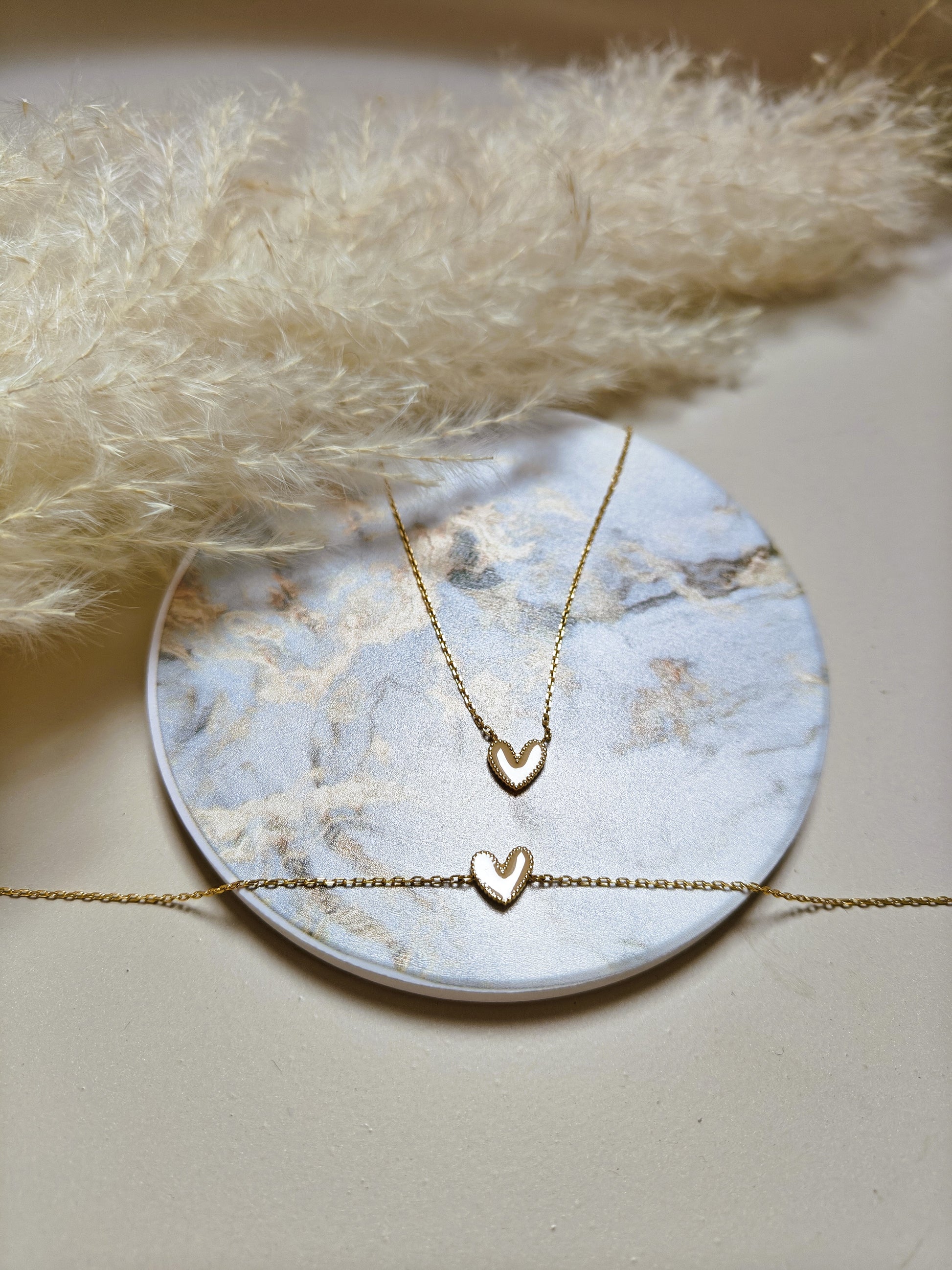 Collier raffiné en acier inoxydable doré, orné d’un charm en forme de cœur et d’un lien beige délicat. Un bijou subtil et élégant, parfait pour ajouter une touche de tendresse à votre quotidien.