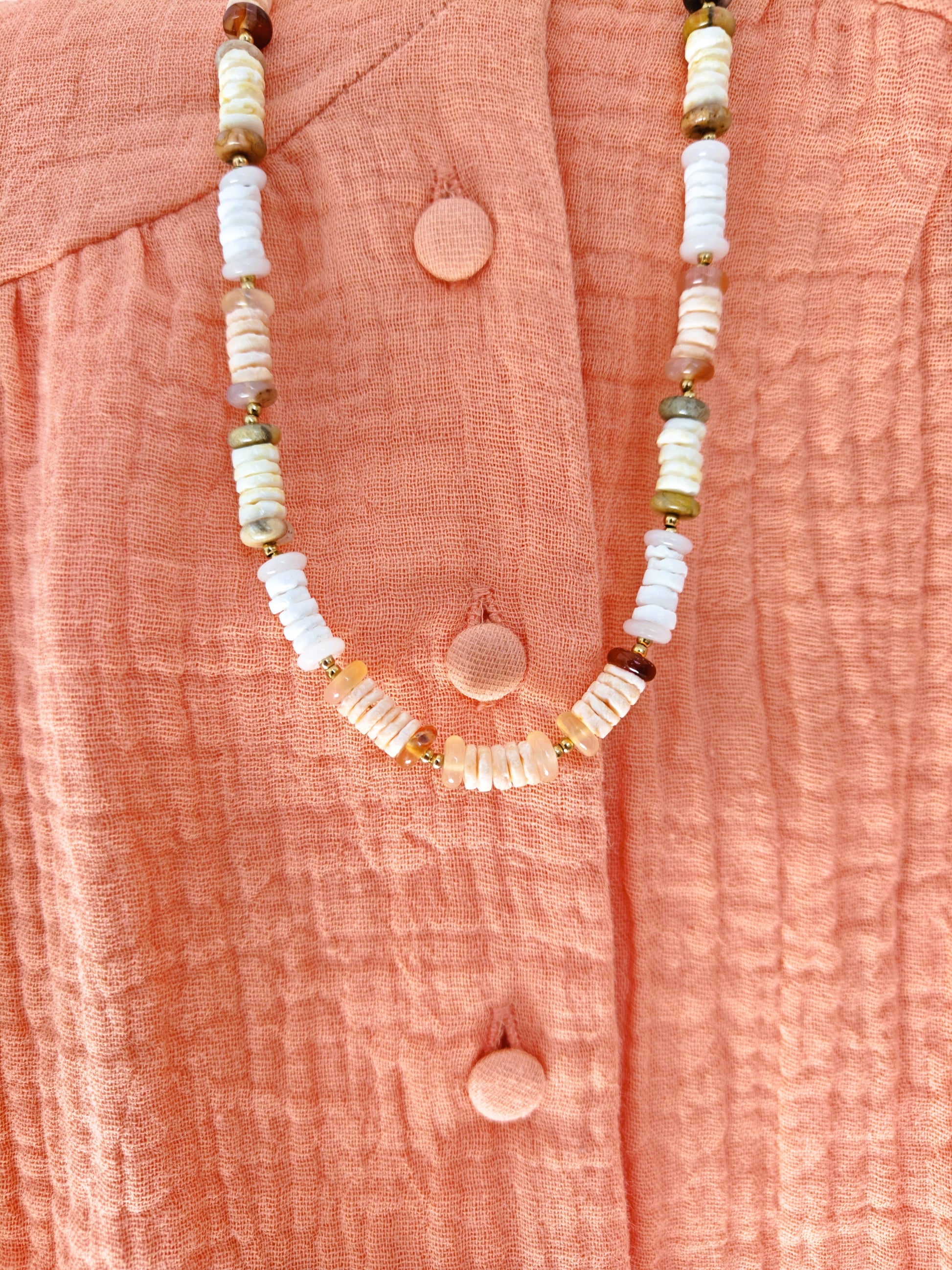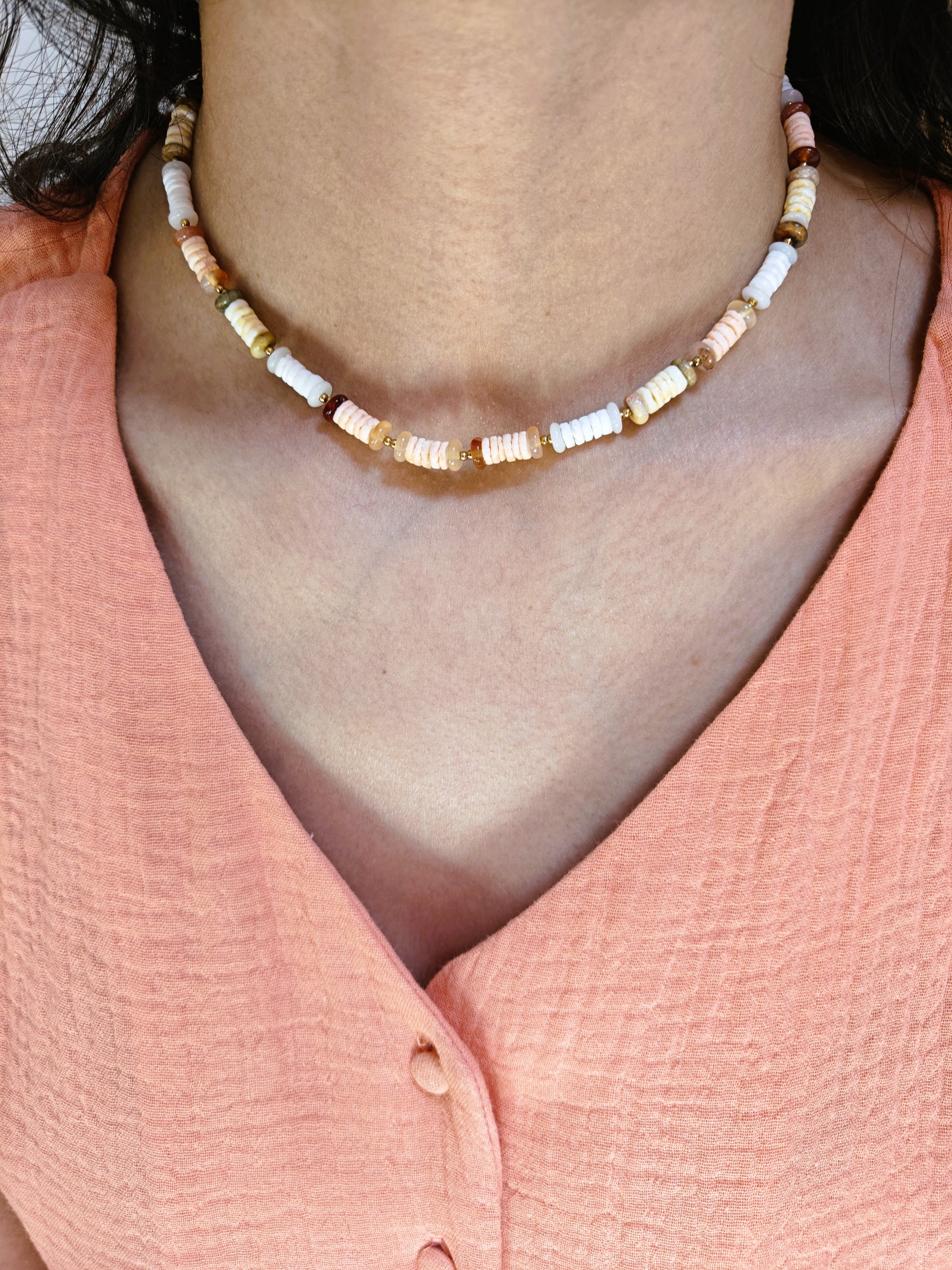 Un collier aux teintes saumon délicates, parfait pour ajouter une touche de fraîcheur et de féminité à vos tenues.
