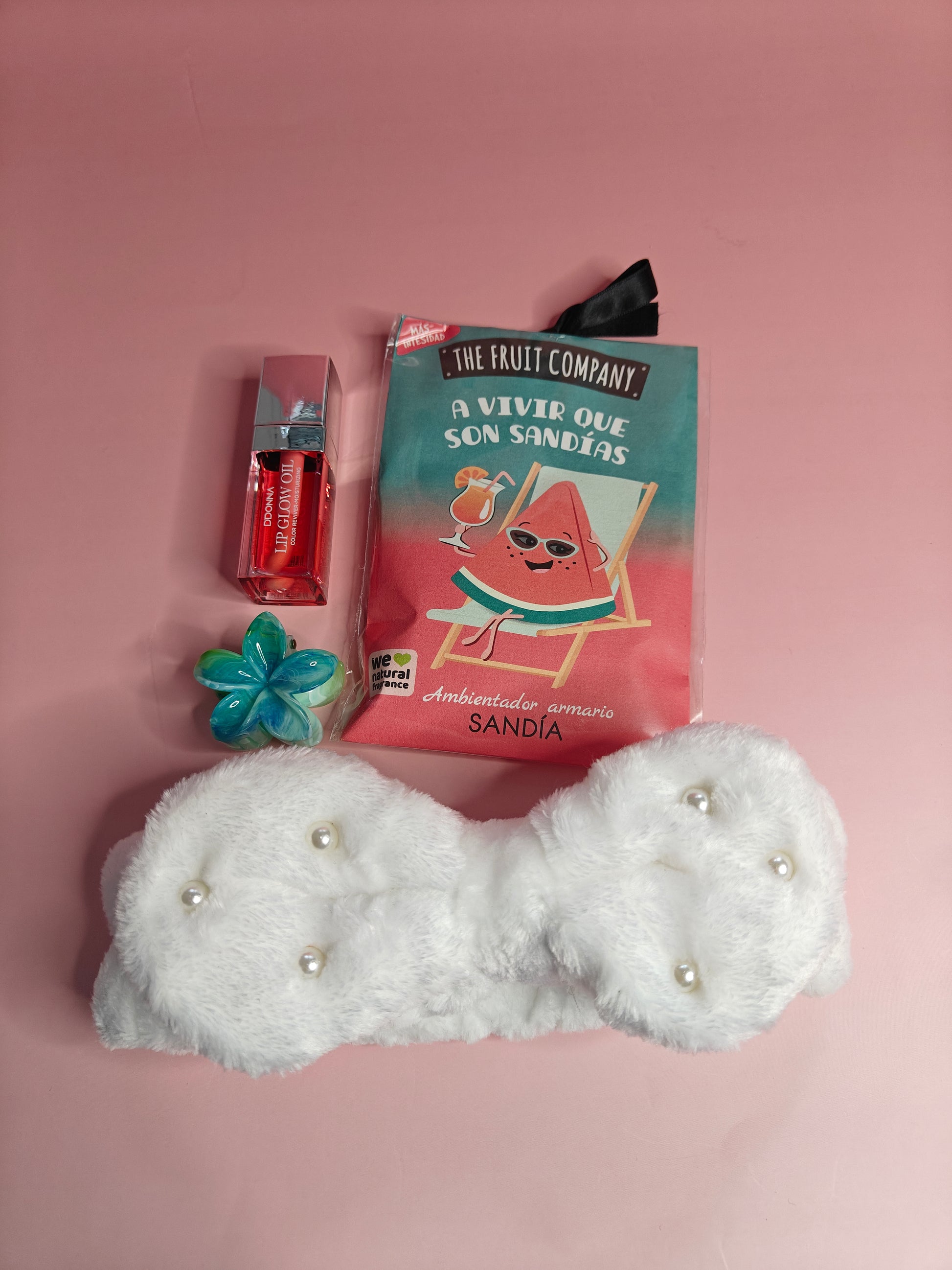 Un souffle de délicatesse s’invite sous le sapin : un bandeau doux comme un rêve, une huile à levre pour sublimer les sourires, et un sachet parfumé qui glisse son arôme discret dans les armoires. En cadeau, une jolie pince à cheveux, éclatante comme une étoile, pour parfaire chaque touche de beauté.