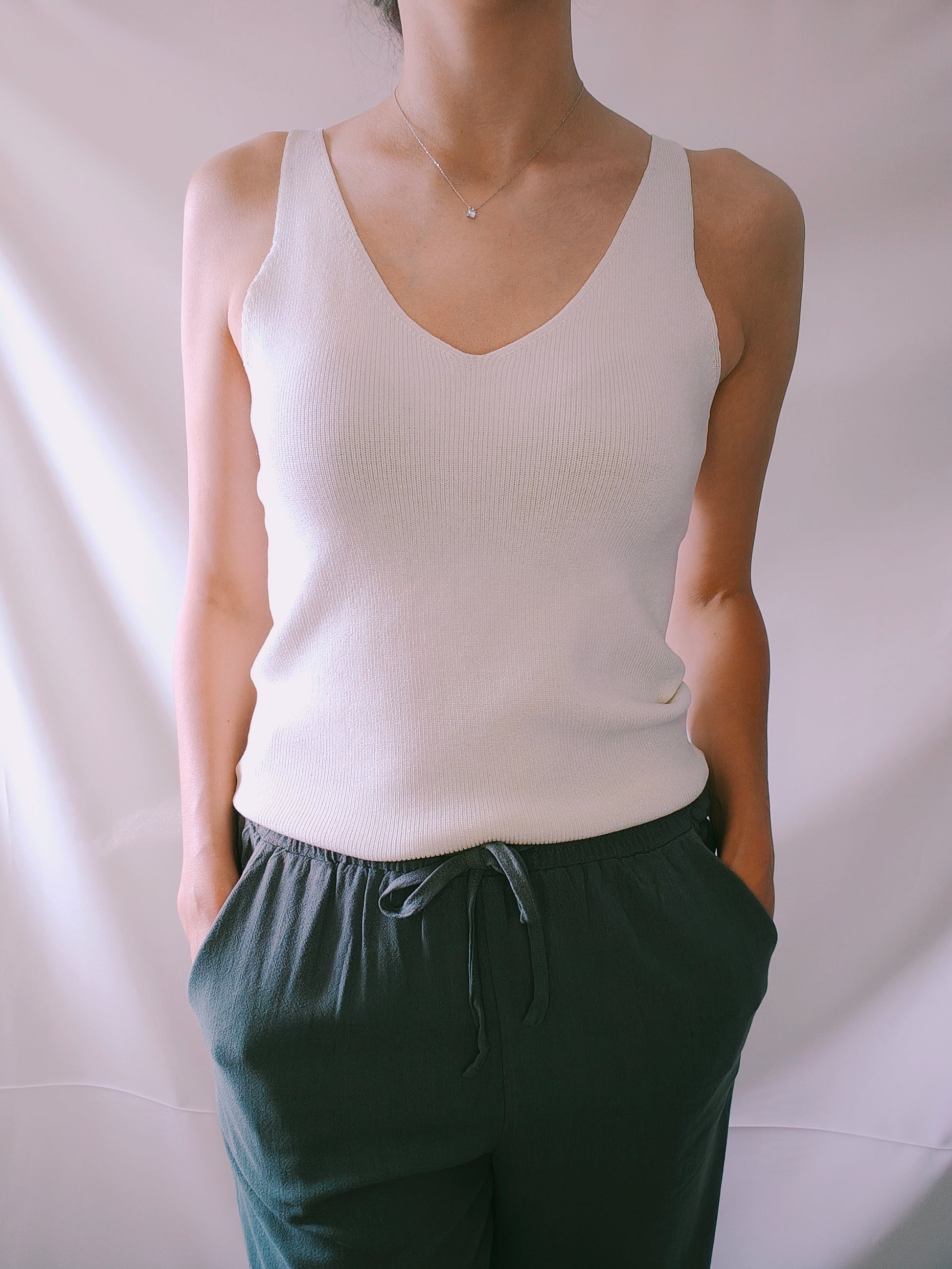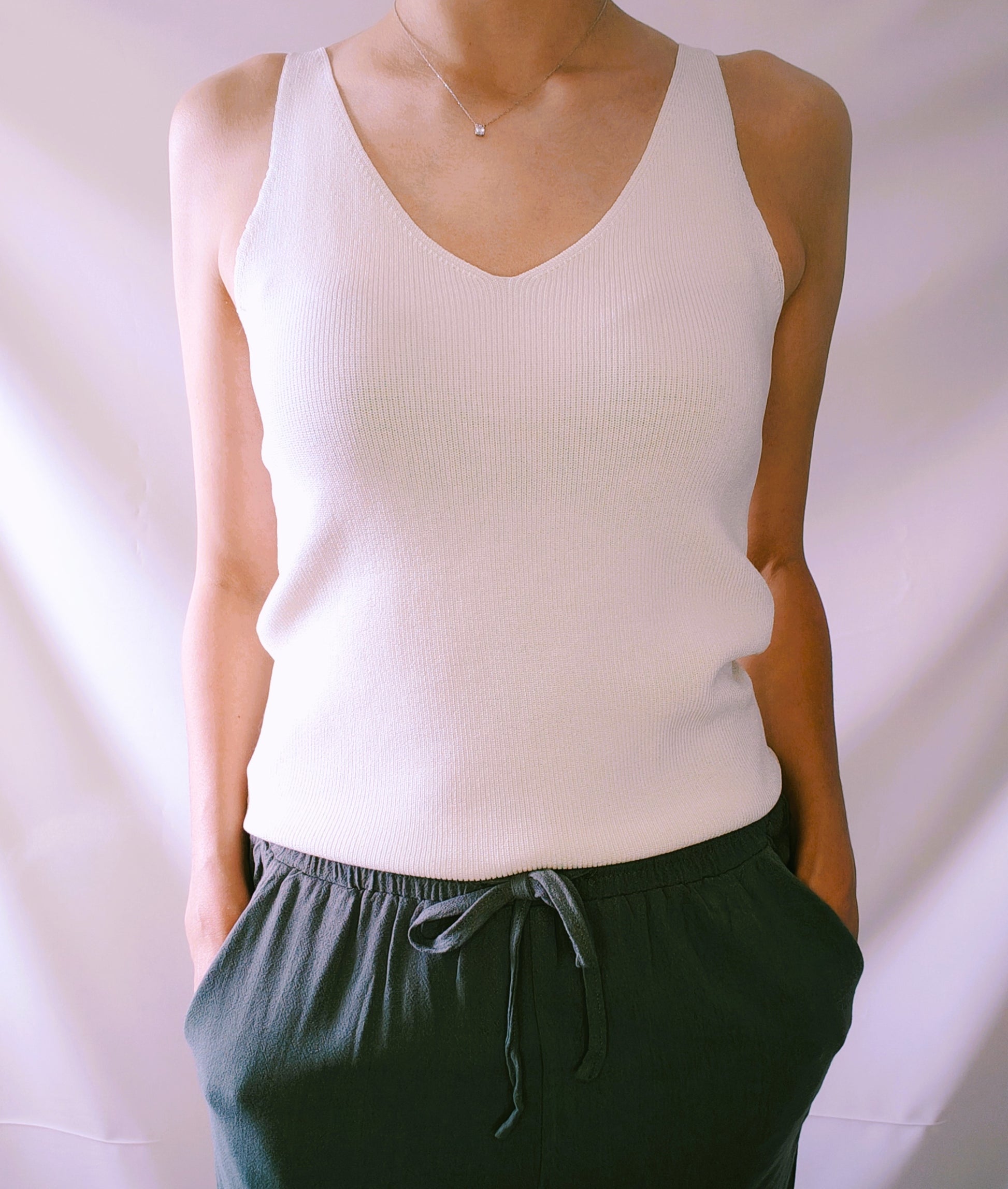 Ce débardeur beige en maille combine simplicité et élégance. Sa texture légère et aérée offre une sensation de confort, tout en apportant une touche de sophistication à vos tenues estivales. Parfait pour une journée décontractée ou une superposition chic, il se prête à toutes les occasions avec un style naturel et raffiné.