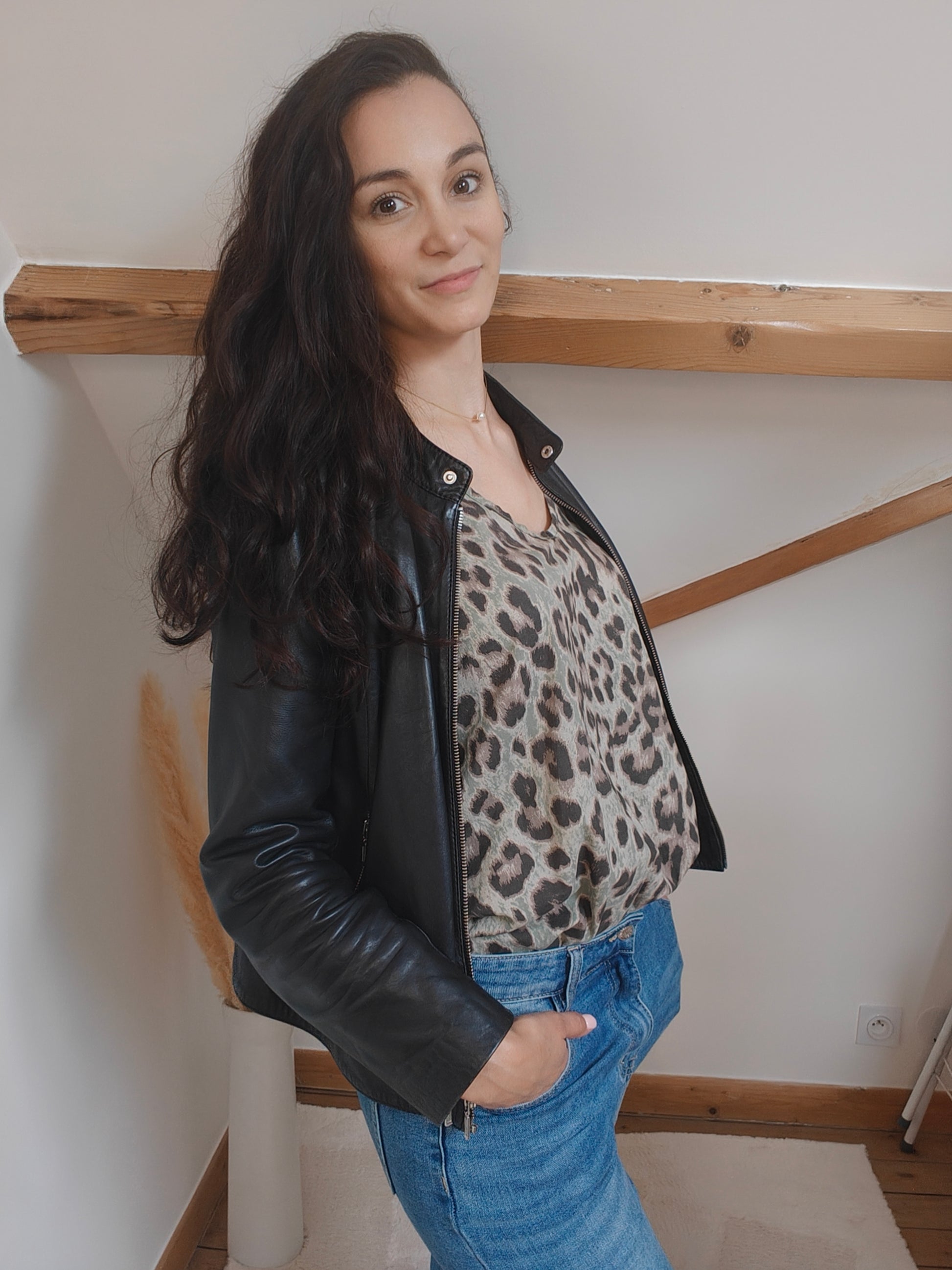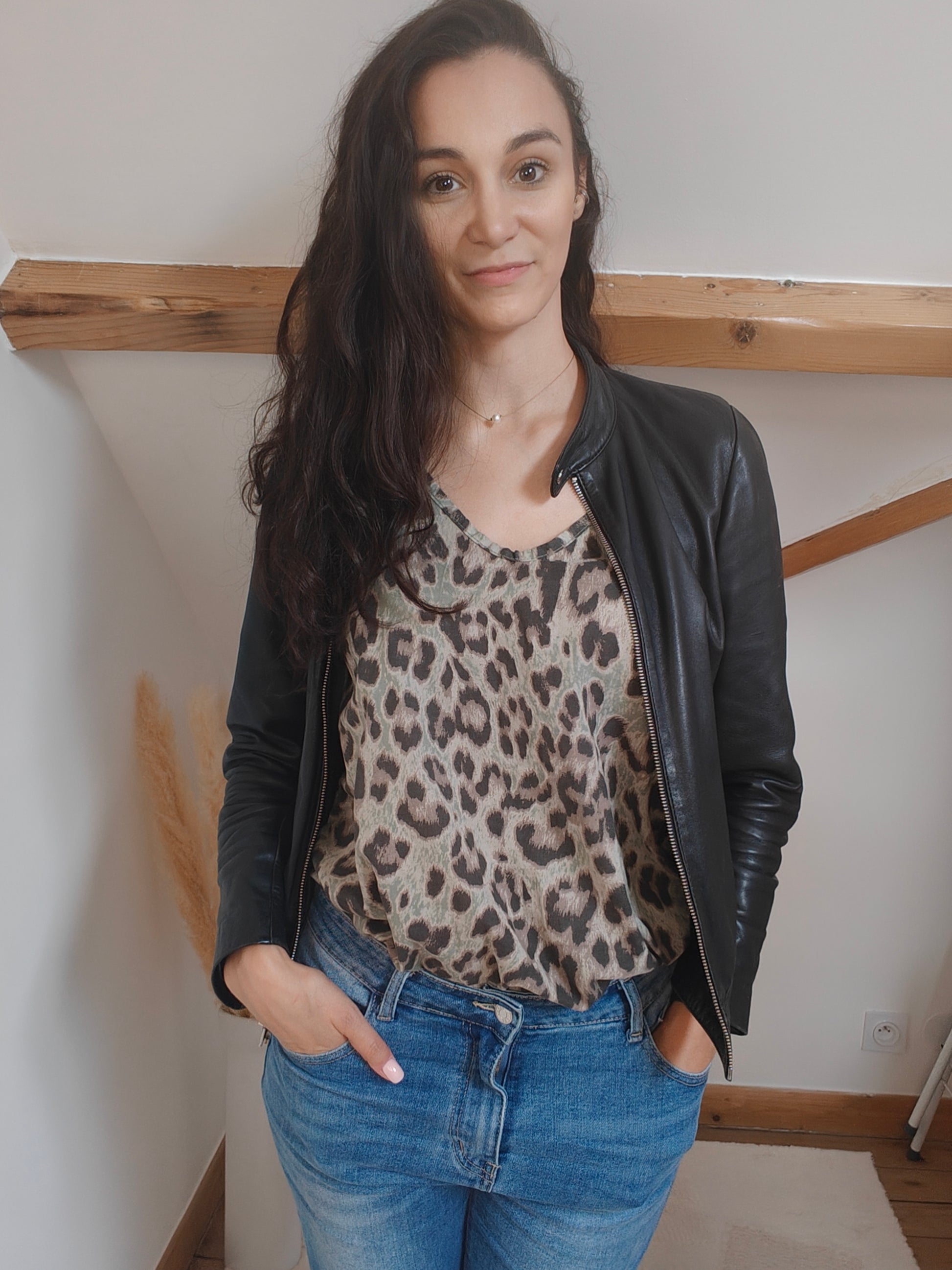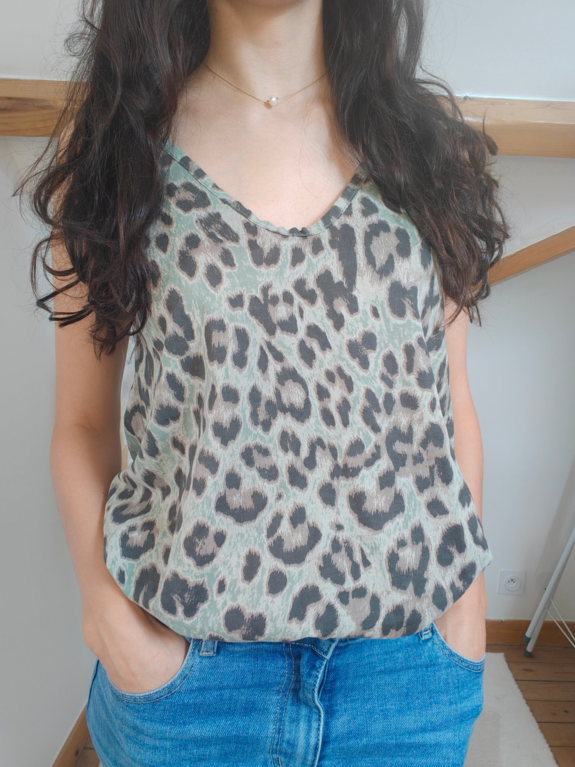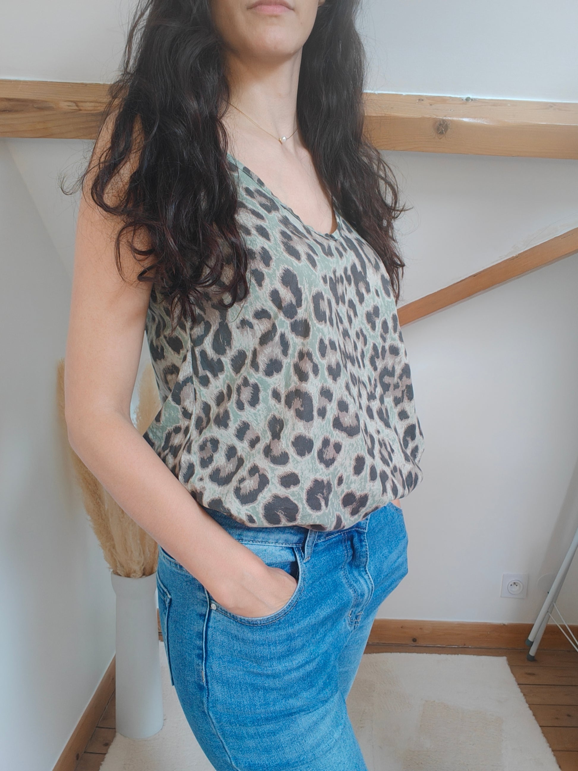 Ce débardeur revisite l’imprimé léopard dans une version audacieuse et moderne, teintée de vert. Un jeu de contrastes subtils qui réinvente un motif classique avec une touche inattendue.