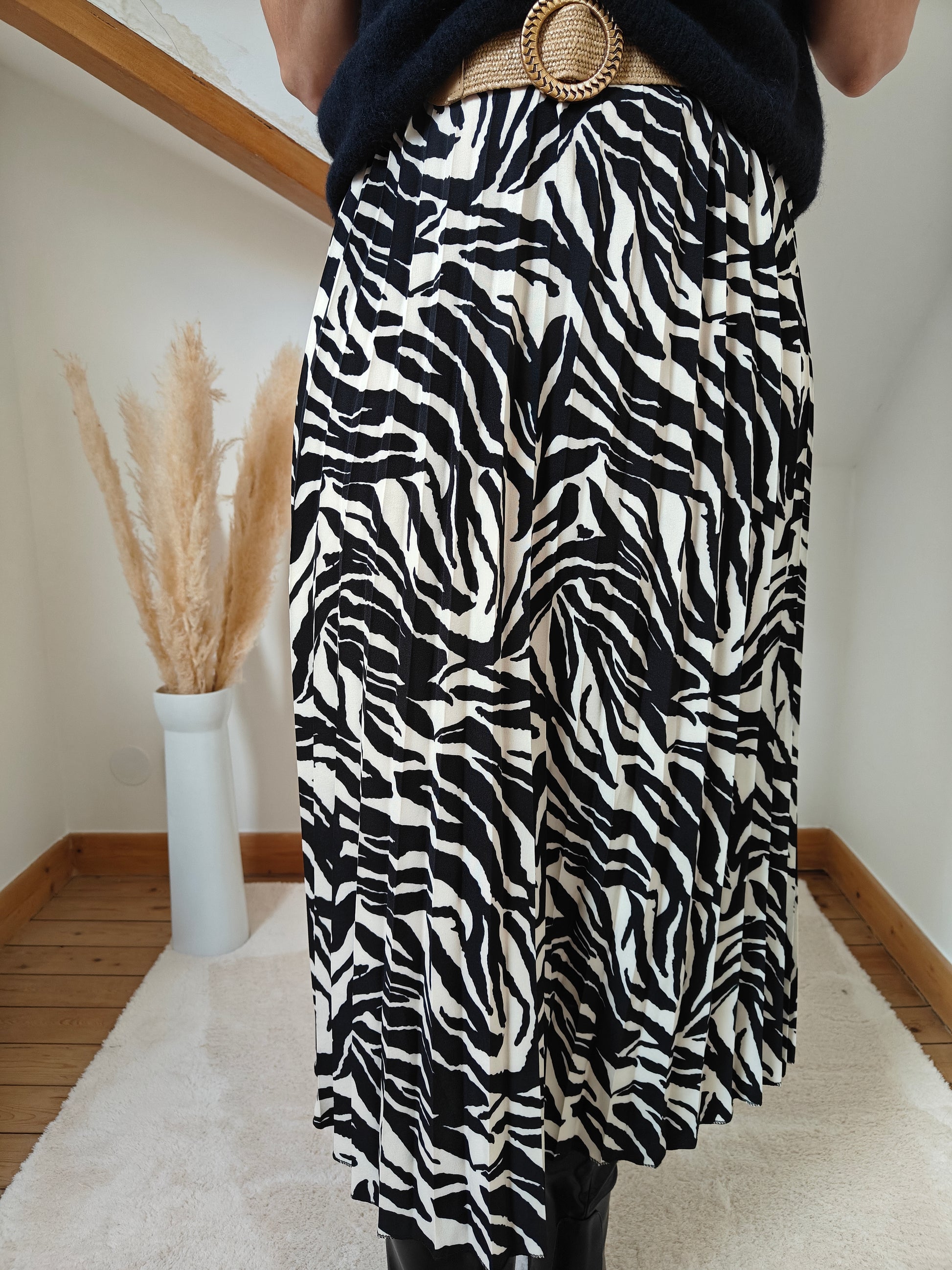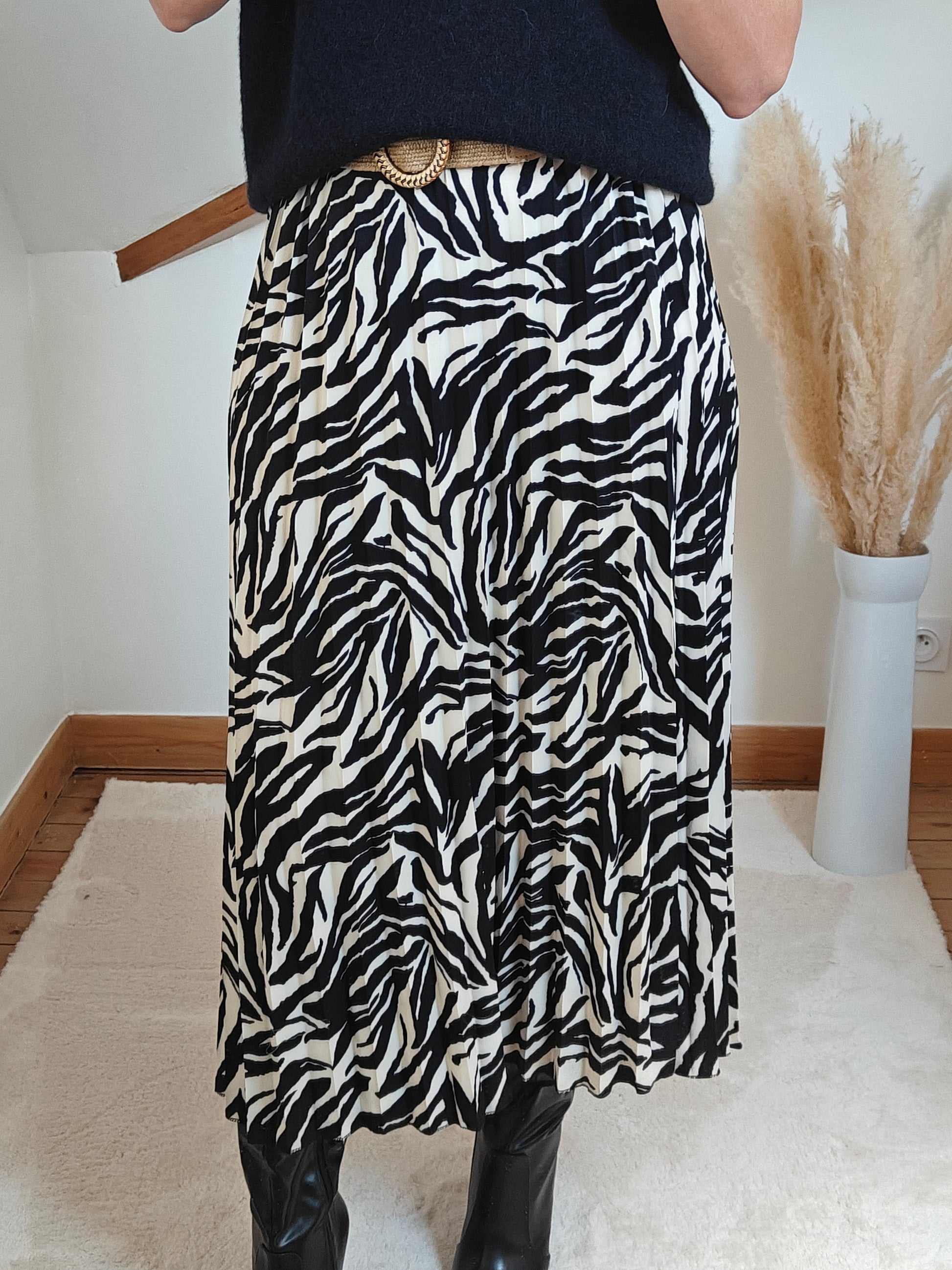 Jupe zébrée au motif audacieux et tendance. Coupe fluide et féminine, parfaite pour dynamiser un look basique. À associer avec un haut uni pour un style équilibré et moderne.