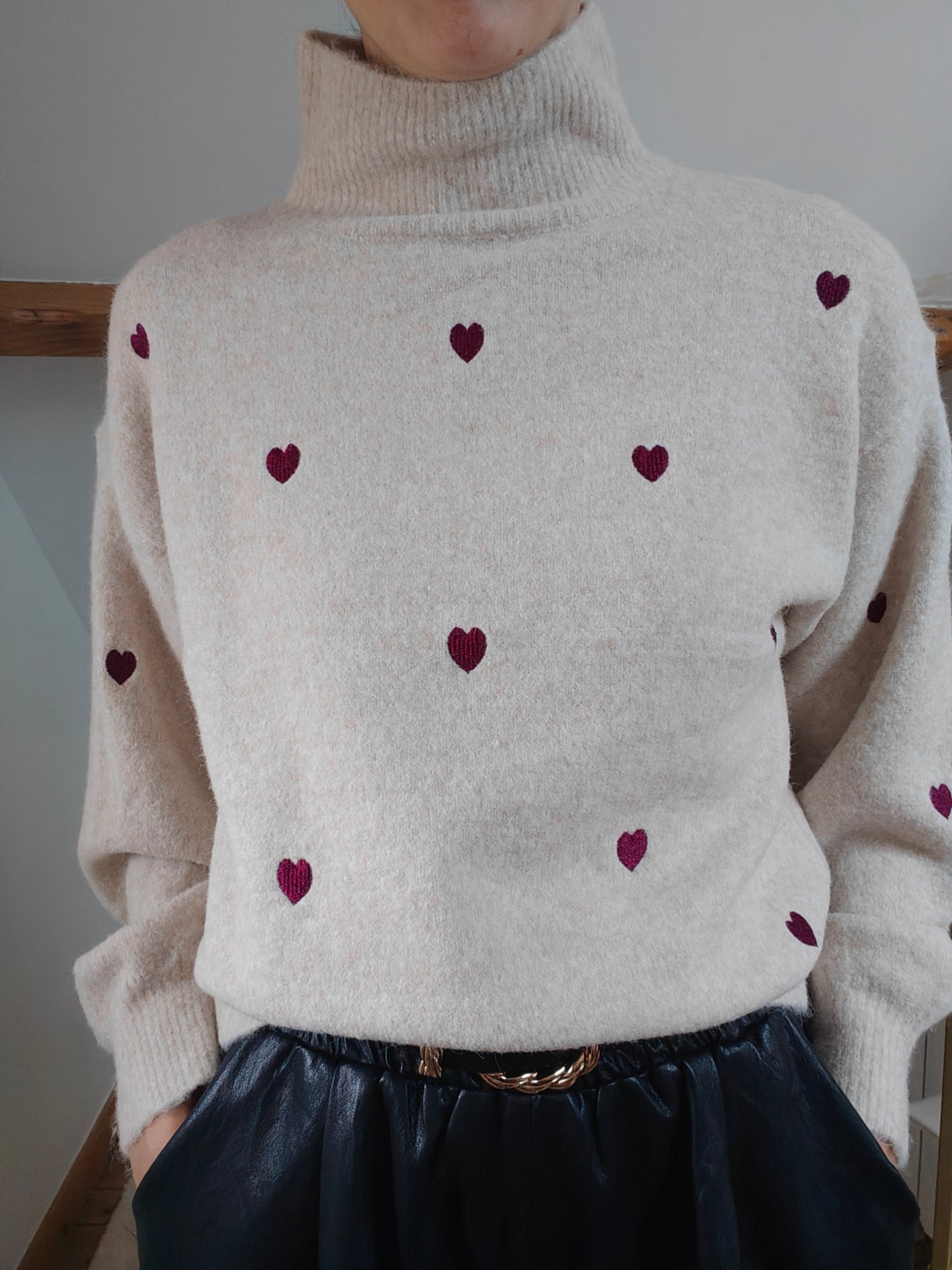 Doux et féminin, ce pull beige est sublimé par des cœurs bordeaux violine qui apportent une touche romantique et élégante. Confortable et chaleureux, il est idéal pour un look tendre et tendance.