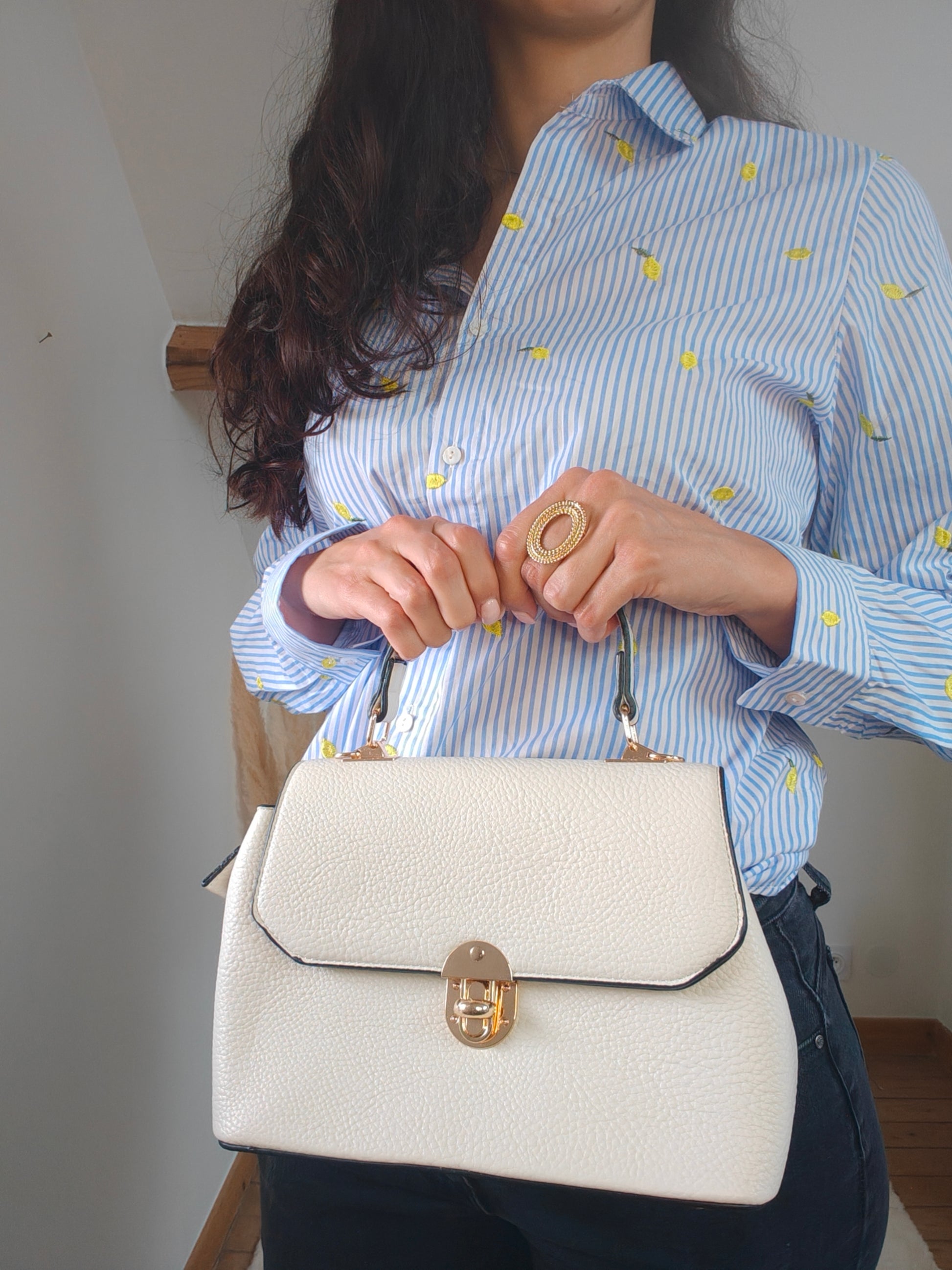 Ce petit sac blanc se distingue par son design minimaliste et sa polyvalence. Compact et léger, il se porte aussi bien à la main qu’en bandoulière, selon l’envie du jour.