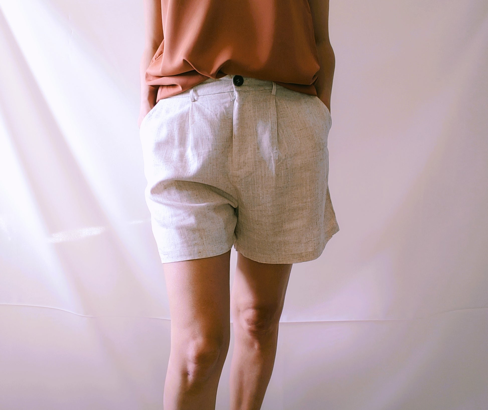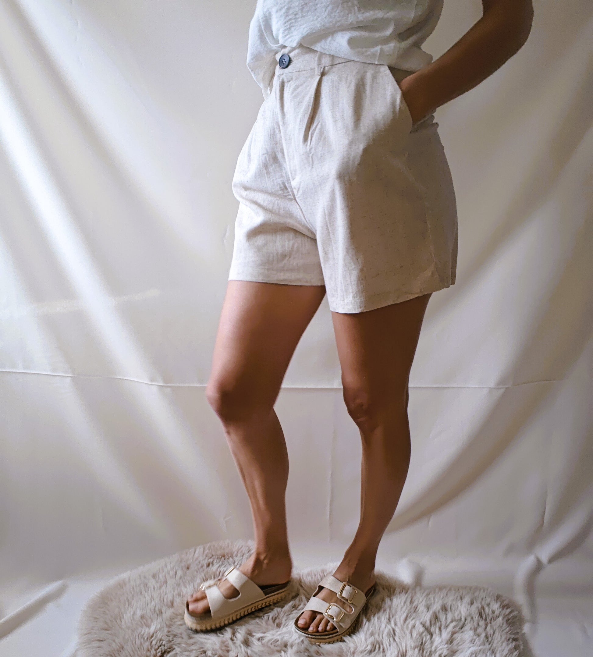 Short beige, ultra-léger et respirant, idéal pour rester fraîche avec style tout l'été. Sa coupe féminine et fluide met en valeur la silhouette tout en offrant un confort naturel et une allure chic sans effort.